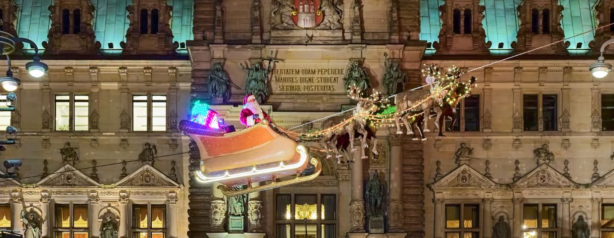 Another highlight and must-see for those in Hamburg over Christmas is the famous Flying Santa. Taking to the skies over the Town Hall Square at 4 pm, 6 pm and 8 pm daily, see Santa Claus in his sleigh on his reindeer as he waves down to the market crowds.