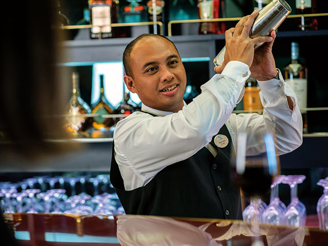 The inviting, spacious and sociable Ocean Bar is a great place to celebrate the joy of music and dance in the very best of company. Choose from a premium selection of gins and perfectly paired tonics, or a delicious martini cocktail at our Martini Experience evenings - shaken, not stirred of course! We have a wide selection of wine, beers, spirits and non-alcoholic options too. After the evening show, the resident band or DJ will ensure you're having a great time on the dancefloor.