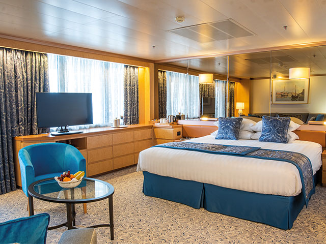 Priority check-in on cruises from the UK and a bottle of sparkling wine on arrival will ensure you're perfectly relaxed when you are first welcomed into your suite. Daily canapés and a fruit basket are also available, as are comfortable bathrobes and slippers. Binoculars are on hand, along with a world atlas, for you to use - ideal for our Scenic Discoveries, where you'll marvel at the beautiful islands, lochs and seascapes Bolette will cruise past.